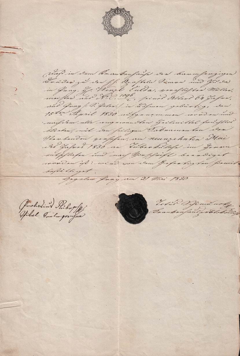 Originální dokument // Stav zboží: použité // Tematický popis: Úmrtní list // Datum vystavení: 31.5.1850 // Místo vystavení: Praha // Dnešní okres: Hlavní město Praha // Dnešní stát: Česká republika // Jméno: Václav // Příjmení: Čulda // Rodné příjmení: Čulda // Jiné příjmení: // Datum narození: ..1786 // Místo narození: // Dnešní okres: // Dnešní stát: Česká republika // Jméno partnera: // Příjmení partnera: // Rodné příjmení partnera: // Jiné příjmení partnera: // Datum narození partnera: .. // Místo narození partnera: // Dnešní okres: // Dnešní stát: // Příjmení: Culda // Poznámka: Zemřel dne 19.5.1850. Mlynářský mistr z Prahy 2, č.1096.