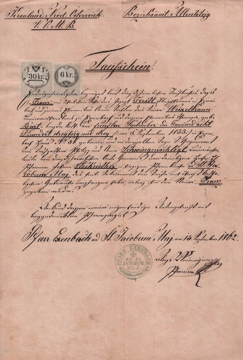 Originální dokument // Stav zboží: použité // Tematický popis: Rodný list // Datum vystavení: 13.9.1862 // Místo vystavení: Echsenbach // Dnešní okres: Zwettl // Dnešní stát: Rakousko // Jméno: František // Příjmení: Ferstl // Rodné příjmení: Ferstl // Jiné příjmení: // Datum narození: 5.9.1833 // Místo narození: Echsenbach // Dnešní okres: Zwettl // Dnešní stát: Rakousko // Jméno partnera: // Příjmení partnera: // Rodné příjmení partnera: // Jiné příjmení partnera: // Datum narození partnera: .. // Místo narození partnera: // Dnešní okres: // Dnešní stát: // Příjmení: Ferstl // Poznámka: