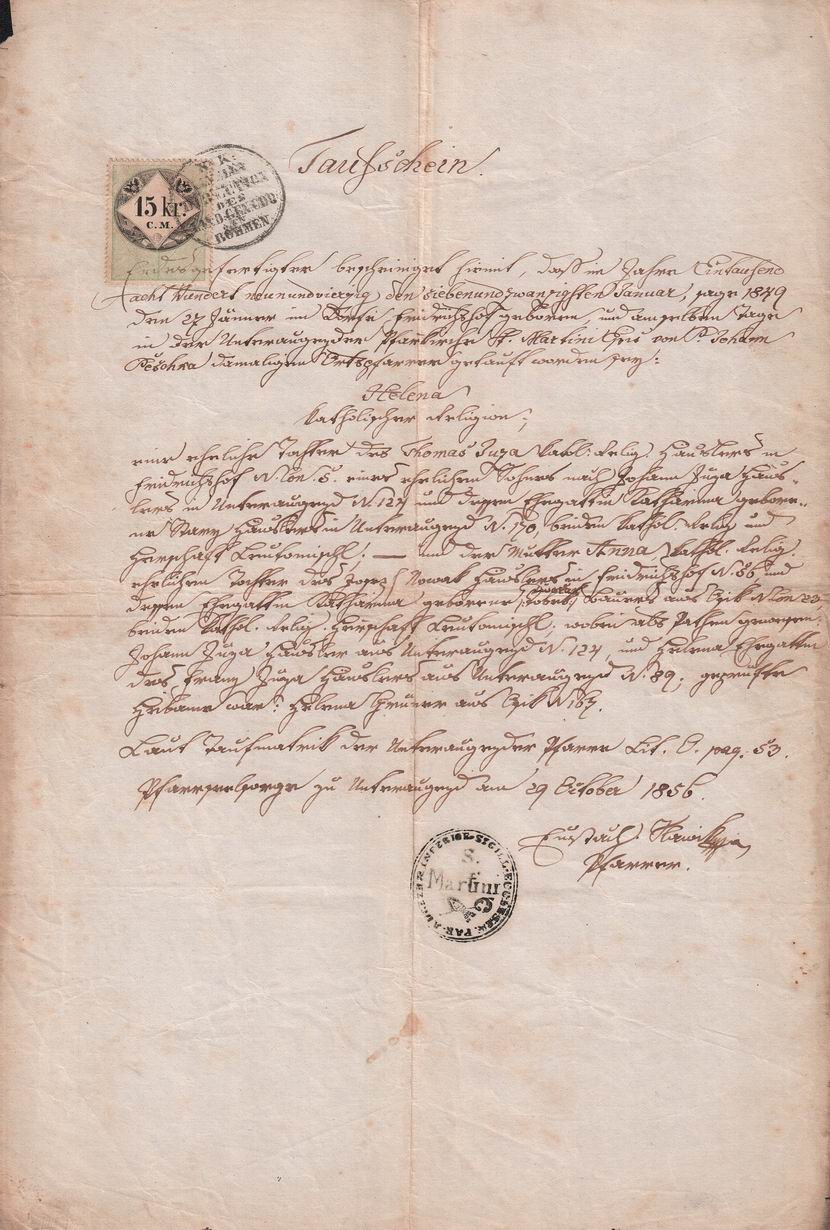 Originální dokument // Stav zboží: použité // Tematický popis: Rodný list // Datum vystavení: 29.10.1856 // Místo vystavení: Dolní Újezd // Dnešní okres: Svitavy // Dnešní stát: Česká republika // Jméno: Helena // Příjmení: Juzová // Rodné příjmení: Juzová // Jiné příjmení: // Datum narození: 27.1.1849 // Místo narození: Pohodlí // Dnešní okres: Svitavy // Dnešní stát: Česká republika // Jméno partnera: // Příjmení partnera: // Rodné příjmení partnera: // Jiné příjmení partnera: // Datum narození partnera: .. // Místo narození partnera: // Dnešní okres: // Dnešní stát: // Příjmení: Juza // Poznámka: