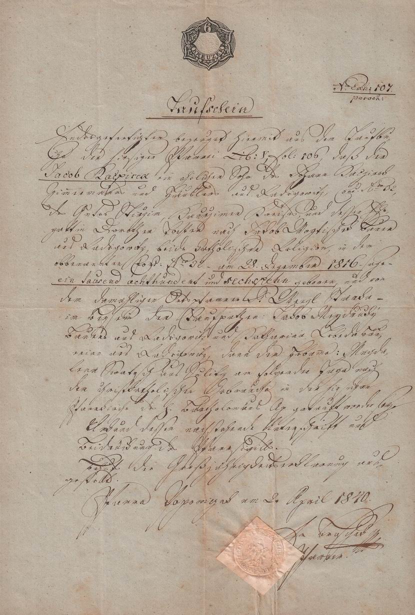 Originální dokument // Stav zboží: použité // Tematický popis: Rodný list // Datum vystavení: 2.4.1840 // Místo vystavení: Popovičky // Dnešní okres: Praha-východ // Dnešní stát: Česká republika // Jméno: Jakub // Příjmení: Kačírek // Rodné příjmení: Kačírek // Jiné příjmení: // Datum narození: 28.12.1816 // Místo narození: Radějovice // Dnešní okres: Praha-východ // Dnešní stát: Česká republika // Jméno partnera: // Příjmení partnera: // Rodné příjmení partnera: // Jiné příjmení partnera: // Datum narození partnera: .. // Místo narození partnera: // Dnešní okres: // Dnešní stát: // Příjmení: Kacirek // Poznámka: