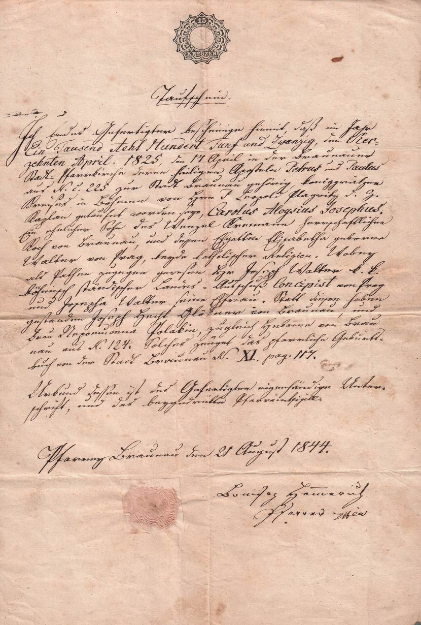 Originální dokument // Stav zboží: použité // Tematický popis: Rodný list // Datum vystavení: 21.8.1844 // Místo vystavení: Broumov // Dnešní okres: Náchod // Dnešní stát: Česká republika // Jméno: Karel // Příjmení: Kremann // Rodné příjmení: Kremann // Jiné příjmení: // Datum narození: 14.4.1825 // Místo narození: Broumov // Dnešní okres: Náchod // Dnešní stát: Česká republika // Jméno partnera: // Příjmení partnera: // Rodné příjmení partnera: // Jiné příjmení partnera: // Datum narození partnera: .. // Místo narození partnera: // Dnešní okres: // Dnešní stát: // Příjmení: Kremann // Poznámka: