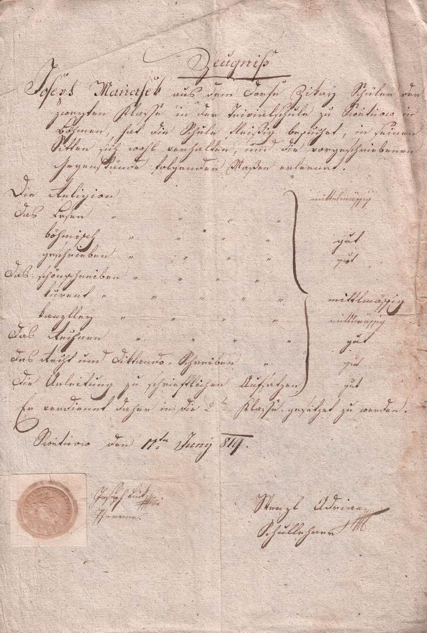 Maňásek Josef_Školní vysvědčení_Místo vystavení: Světnov_Dnešní okres: Žďár nad Sázavou_Datum vystavení: 11.6.1819_10765