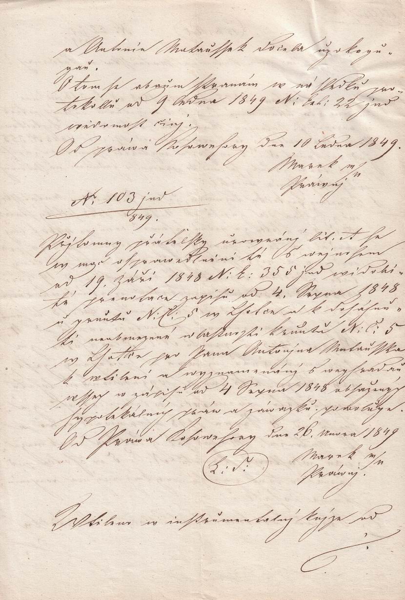 Originální dokument // Stav zboží: použité // Tematický popis: Úřední rozsudek // Datum vystavení: 10.1.1849 // Místo vystavení: Kosova Hora // Dnešní okres: Příbram // Dnešní stát: Česká republika // Jméno: Antonín // Příjmení: Matoušek // Rodné příjmení: Matoušek // Jiné příjmení: // Datum narození: .. // Místo narození: // Dnešní okres: // Dnešní stát: // Jméno partnera: // Příjmení partnera: // Rodné příjmení partnera: // Jiné příjmení partnera: // Datum narození partnera: .. // Místo narození partnera: // Dnešní okres: // Dnešní stát: // Příjmení: Matousek, Bezkocka // Poznámka: Antonín Matoušek, Sedlčany, Příbram. Václav Bezkočka, Lhotka, Sedlčany, Příbram.