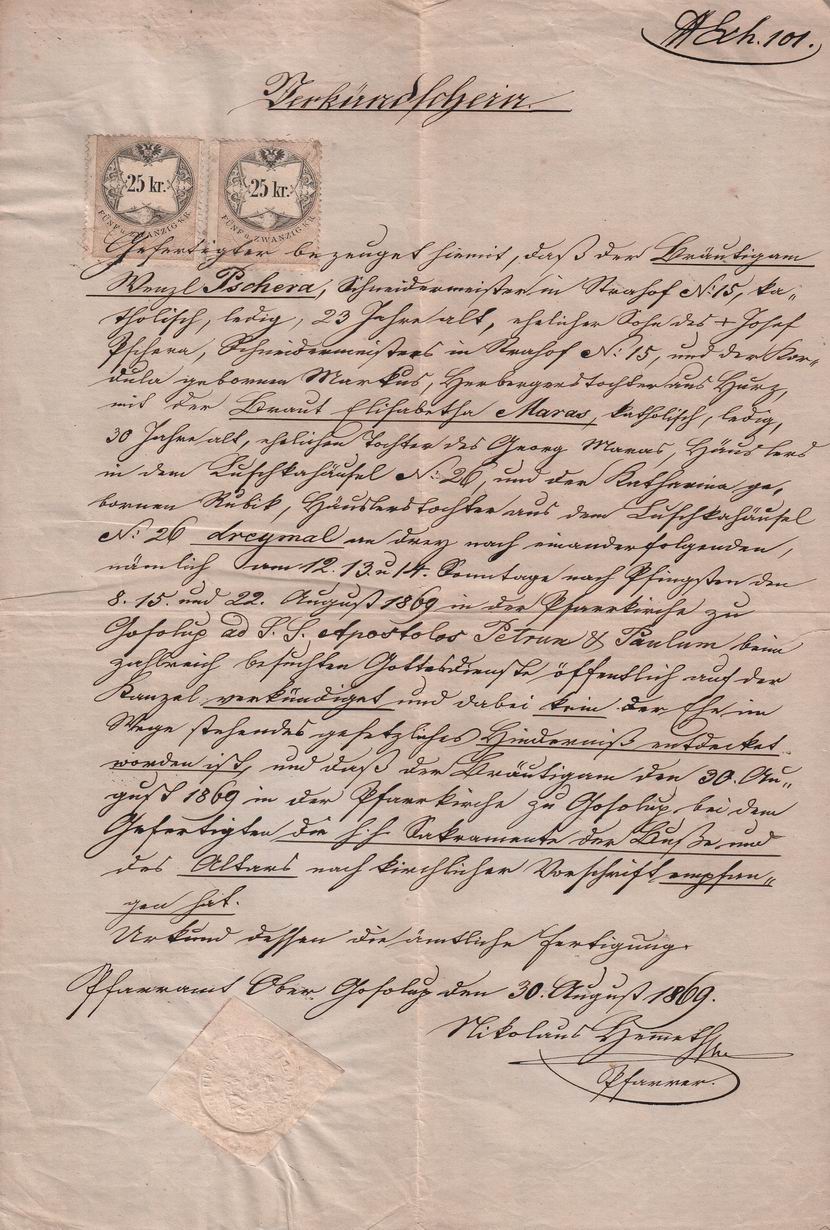 Originální dokument // Stav zboží: použité // Tematický popis: Ohlášní list // Datum vystavení: 30.8.1869 // Místo vystavení: Horní Kozolupy // Dnešní okres: Tachov // Dnešní stát: Česká republika // Jméno: Václav // Příjmení: Pschera // Rodné příjmení: Pschera // Jiné příjmení: // Datum narození: ..1846 // Místo narození: Strahov // Dnešní okres: Tachov // Dnešní stát: Česká republika // Jméno partnera: Alžběta // Příjmení partnera: Marasová // Rodné příjmení partnera: Maras // Jiné příjmení partnera: // Datum narození partnera: ..1839 // Místo narození partnera: // Dnešní okres: // Dnešní stát: // Příjmení: Pschera, Maras // Poznámka:
