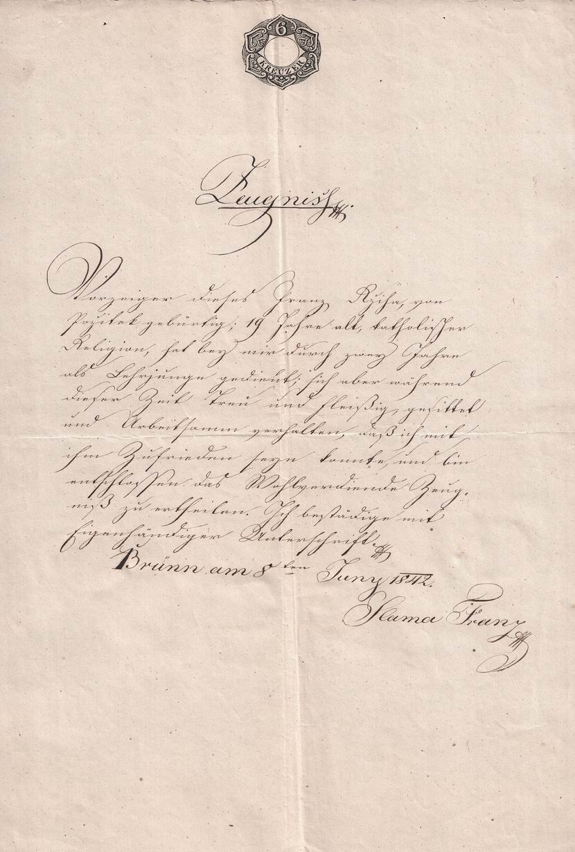Říha František_Pracovní vysvědčení_Místo vystavení: Brno_Dnešní okres: Brno-město_Datum vystavení: 8.6.1842_10772