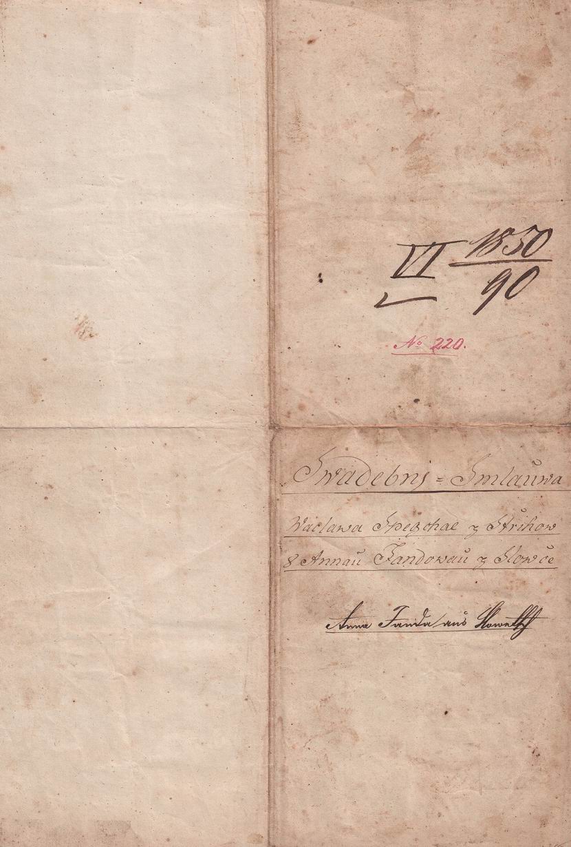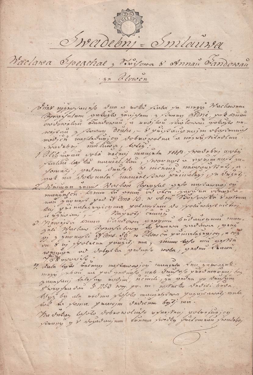 Originální dokument // Stav zboží: použité // Tematický popis: Svatební smlouva // Datum vystavení: 21.1.1844 // Místo vystavení: Sloveč // Dnešní okres: Nymburk // Dnešní stát: Česká republika // Jméno: Václav // Příjmení: Spejchal // Rodné příjmení: Spejchal // Jiné příjmení: // Datum narození: .. // Místo narození: // Dnešní okres: // Dnešní stát: // Jméno partnera: Anna // Příjmení partnera: Jandová // Rodné příjmení partnera: Jandová // Jiné příjmení partnera: // Datum narození partnera: .. // Místo narození partnera: // Dnešní okres: // Dnešní stát: // Příjmení: Spejchal, Janda // Poznámka: