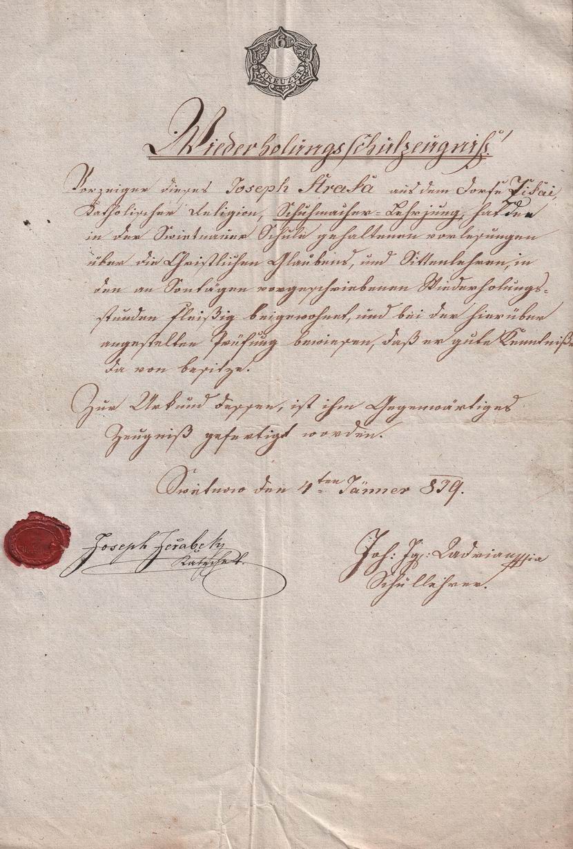 Originální dokument // Stav zboží: použité // Tematický popis: Opakovací školní vysvědčení // Datum vystavení: 4.1.1839 // Místo vystavení: Světnov // Dnešní okres: Žďár nad Sázavou // Dnešní stát: Česká republika // Jméno: Josef // Příjmení: Straka // Rodné příjmení: Straka // Jiné příjmení: // Datum narození: .. // Místo narození: // Dnešní okres: // Dnešní stát: // Jméno partnera: // Příjmení partnera: // Rodné příjmení partnera: // Jiné příjmení partnera: // Datum narození partnera: .. // Místo narození partnera: // Dnešní okres: // Dnešní stát: // Příjmení: Straka // Poznámka: Bydliště žáka: Cikháj, Žďár nad Sázavou.
