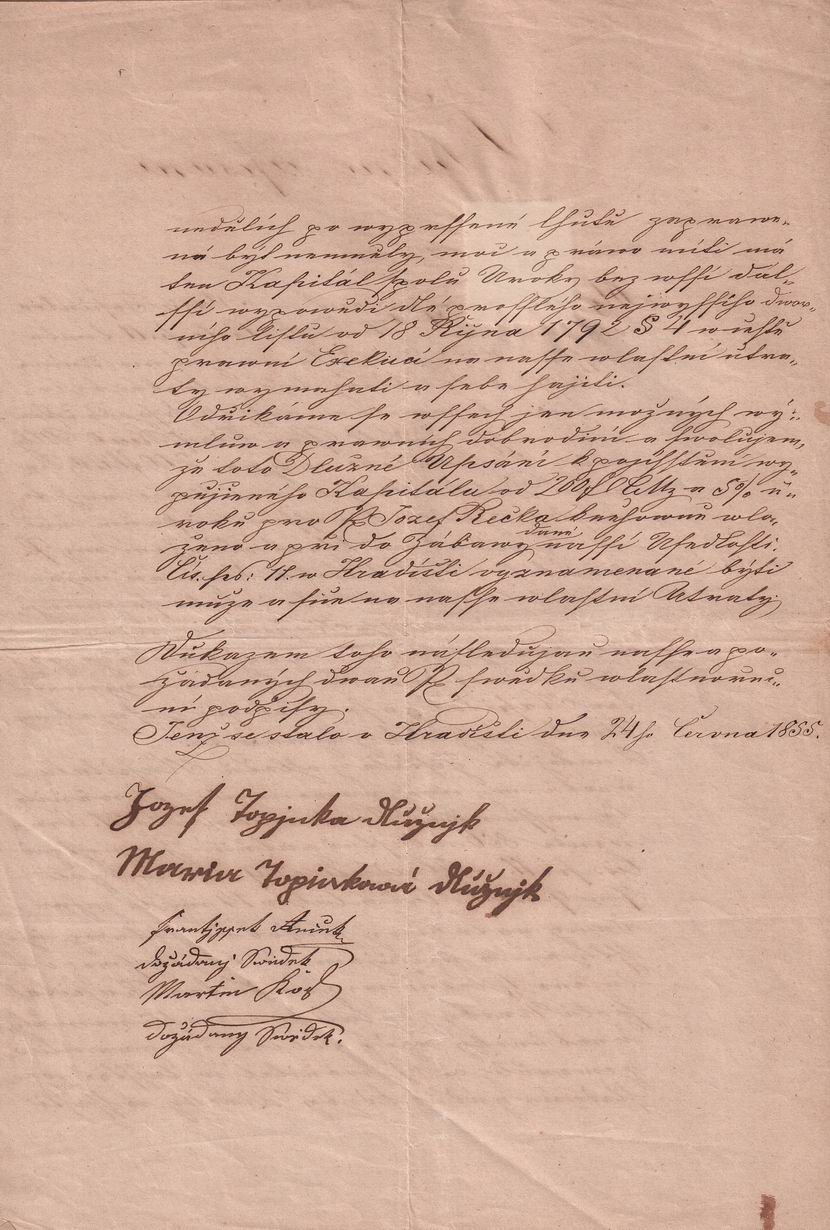 Originální dokument // Stav zboží: použité // Tematický popis: Dlužní úpis // Datum vystavení: 24.6.1855 // Místo vystavení: Hradiště // Dnešní okres: Rokycany // Dnešní stát: Česká republika // Jméno: Josef // Příjmení: Topinka // Rodné příjmení: Topinka // Jiné příjmení: // Datum narození: .. // Místo narození: // Dnešní okres: // Dnešní stát: // Jméno partnera: // Příjmení partnera: // Rodné příjmení partnera: // Jiné příjmení partnera: // Datum narození partnera: .. // Místo narození partnera: // Dnešní okres: // Dnešní stát: // Příjmení: Topinka, Recek // Poznámka: Josef Topinka, Hradiště 11, Rokycany. Josef Reček, Kočkův Mlýn, Slabce, Rakovník.