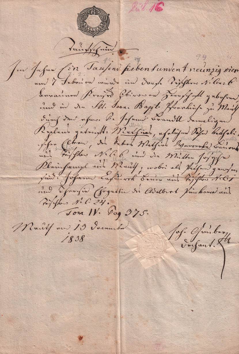 Originální dokument // Stav zboží: použité // Tematický popis: Rodný list // Datum vystavení: 13.12.1838 // Místo vystavení: Mýto // Dnešní okres: Rokycany // Dnešní stát: Česká republika // Jméno: Matěj // Příjmení: Veverka // Rodné příjmení: Veverka // Jiné příjmení: // Datum narození: 7.2.1794 // Místo narození: Těškov // Dnešní okres: Rokycany // Dnešní stát: Česká republika // Jméno partnera: // Příjmení partnera: // Rodné příjmení partnera: // Jiné příjmení partnera: // Datum narození partnera: .. // Místo narození partnera: // Dnešní okres: // Dnešní stát: // Příjmení: Veverka // Poznámka: